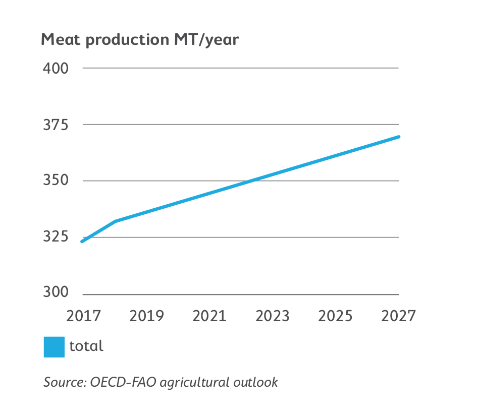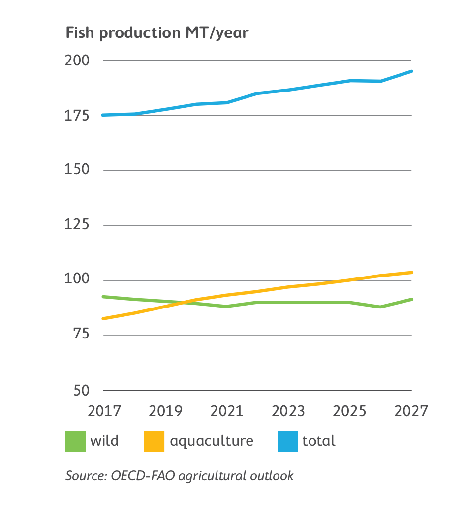 While the global population growth rate is expected to fall from 1.1% to 0.9% by 2027, the world population still continues to grow by 74 million people per year, according to OECD-FAO. As such, to meet a growing society’s ‘hunger’ for meat and fish, production will continue to increase. Fish production will rise from 174 MT to 195 MT (metric tons), with an average growth of 1.1%. However, this growth comes with a heavy dependence on feed production prices needing to remain low in order to continue increasing production.