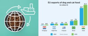 Among the four Mercosur markets, it is Brazil that has the most significant share of the trade. In 2025, EU exports of dog and cat food for retail sale in the country increased by almost 16%, reaching €7.6 million ($8.7M). The other Mercosur nations traded in smaller volumes with the EU.