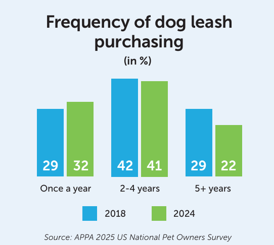 Material preferences shifted between 2018 and 2024, with nylon and cloth now less popular – from 41% to 37% and 30% to 28% respectively. Purchasing frequency has also changed slightly. Leashes are now bought more often than in 2018.