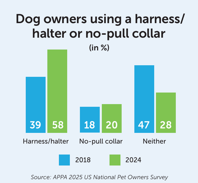 In its 2025 National Pet Owners Survey, the American Pet Products Association (APPA) reports that 58% of dog owners in the US were using a harness in 2024, and another 20% a no-pull collar. This is up from 39% and 18% respectively in 2018.