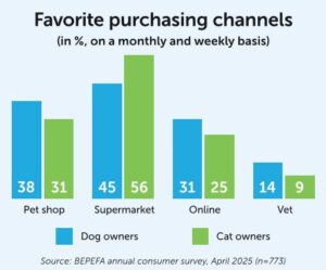 Pet shops and supermarkets remain the most frequently used purchasing channels in Belgium, confirming the continued importance of established retail formats. There are significant differences between dog and cat owners, however, with the former buying more often online, from a pet shop or at a vet’s practice, while cat owners show a definite preference for supermarkets.