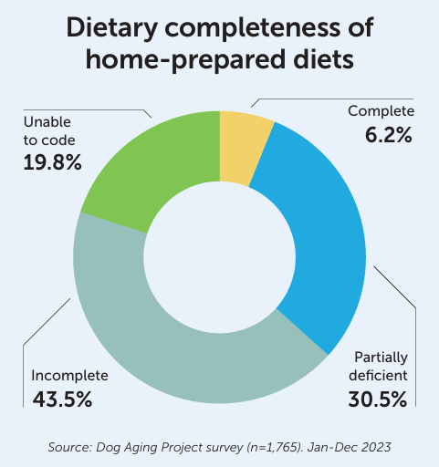 Previous research on home-prepared diets has found that these diets can often be incomplete, and some individual dogs have had adverse health consequences from long-term feeding of home-prepared diets.
