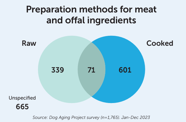 While the most common meat sources were chicken, beef and turkey, dogs in this dataset were also fed pork, lamb, venison, rabbit, duck, buffalo/bison and elk, and fewer than 10 dogs were fed alpaca, antelope, beaver, camel, emu, goose, guinea hen, kangaroo, moose, ostrich, pheasant and quail.