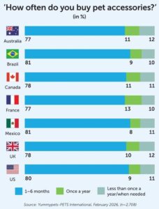 Overall, respondents to the Yummypets and PETS International survey see accessories as occasional buys, which is reflected in how infrequently they purchase them.