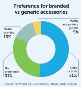 Although brand is the lowest priority when choosing an accessory, more than half of the pet owners (51%) say they buy a mix of branded and generic items. But only 13% opt for mostly branded products, while 5% prefer mostly unbranded. Almost a third (31%) declare no preference in that regard.