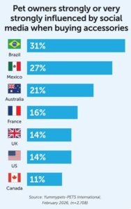 The data reflects how pet parents around the world view accessory purchasing, as 51% of them say they think of these items as ‘an occasional treat’ for their pet. That is even more the case in France (59%), as well as Brazil and Mexico (both at 56%).
