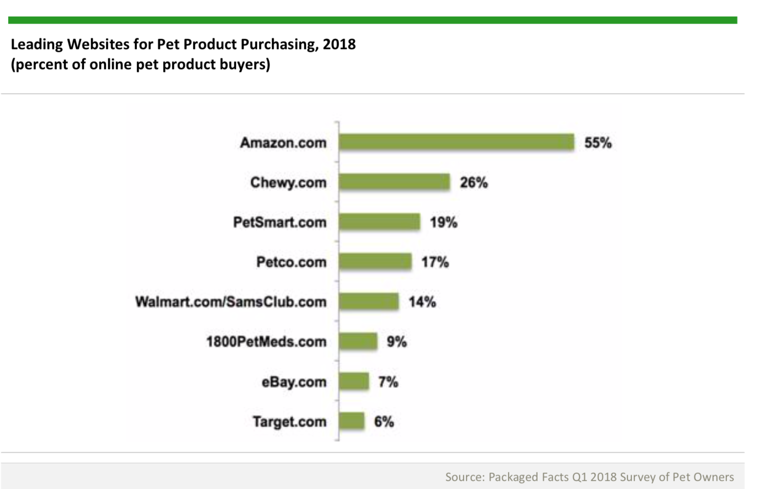 Due to its size, scope, resources, online expertise, brick-and-mortar expansion, and drive to dominate across consumer packaged goods categories, Amazon poses a singular threat to pet market players of all stripes. Amazon remains the frontrunner in online sales of pet products, although with its acquisition of Chewy.com PetSmart made a huge jump. Packaged Facts’ pet owner survey in Q1 2018 shows that Amazon attracts 55% of those who purchase pet products online, followed by Chewy at 26%, PetSmart at 19%, Petco at17%, and Walmart/Sam’s at 14%. When considering the percentage of pet owners whohave ordered online in the last three months, the gap between Amazon and its online challengers widens further, driven in part by Amazon’s strength in pet supplies categoriesother than pet food.