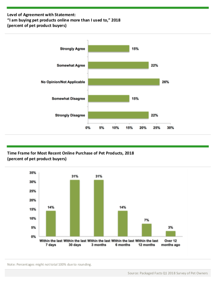 In addition to shopping online in greater numbers, pet owners are doing so frequently.Packaged Facts’ Q1 2018 online survey of U.S. pet owners shows that 14% of online pet product shoppers have made a purchase within the last seven days, and another 31% have done so in the last 30 days. In addition, 37% of online pet product shoppers agree that “I am buying pet products online more than I used to.”