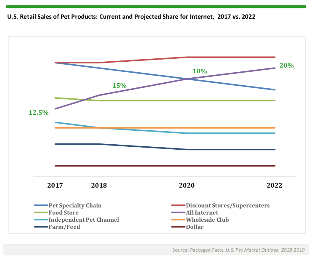 The online surge in pet product purchasing is both a driver and a function of the increased involvement of brick-and-mortar-based retailers. In the past few years, PetSmart, Petco, and Walmart have all been playing catch-up to online-based players, partly through acquisitions.
