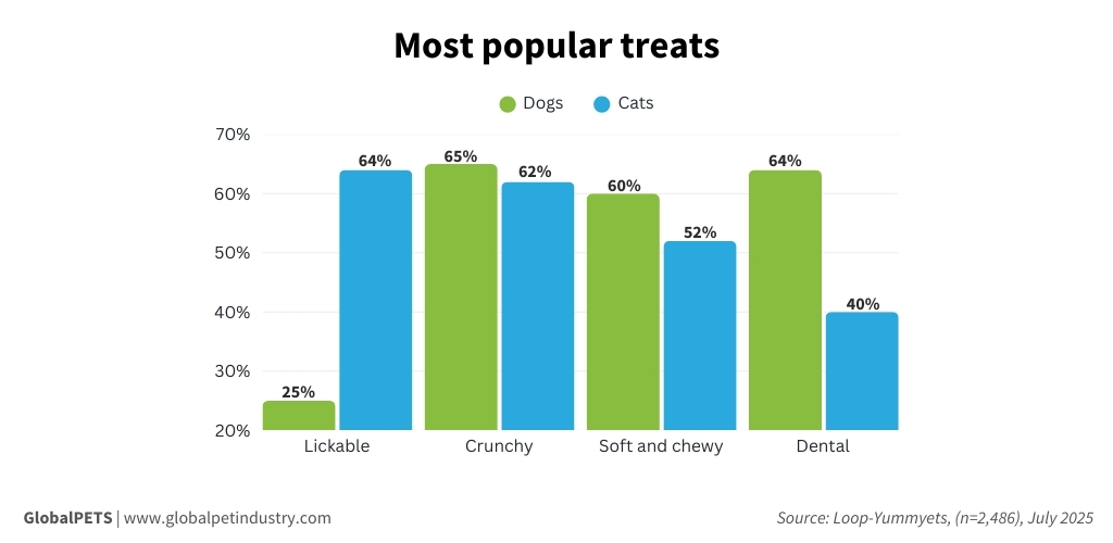 Among cats, lickable treats such as creamy puree or paste are most popular at 64%, followed by crunchy (62%) and soft, chewy treats (52%).