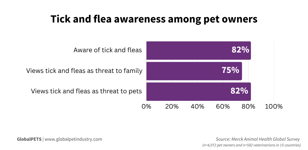 According to Pet Owner & Vet Perspectives on Parasite Treatment and Prevention: A Global Survey by Merck Animal Health, 82% of owners see fleas and ticks as a threat to their pets and 75% as a threat to their families, but vets report that more than half of concerned owners still do not administer treatment year-round.