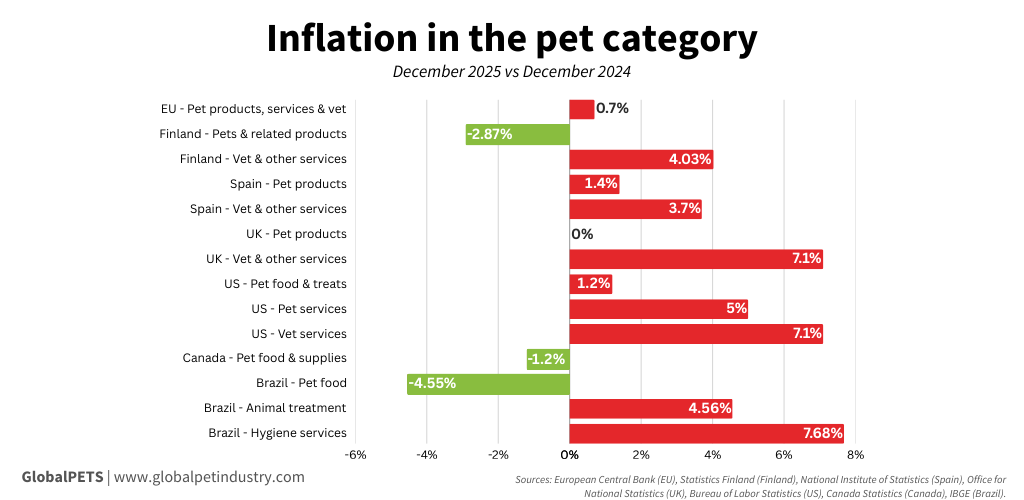 Finland bucked the trend of most countries, with declines in almost all supply categories: -2.87% in pet products, -3.37% in pet food and -1.28% in pet equipment, as per data from Statistics Finland. However, the deviation was not large: veterinary and other pet services experienced an inflation rate of 4.03% in the Nordic country.