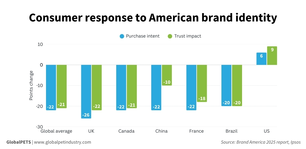 A new report from market research firm Ipsos concludes that there’s an average negative impact of 22 points on trust in American products in non-US markets. According to the Brand America 2025 report, there is a negative impact of 21 points on purchase intent for brands perceived as American.