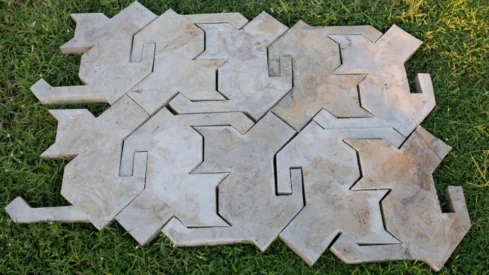 The processed plastic packaging has been turned into cat-shaped flooring tile blocks at a recycling factory. It will be used to pave the outdoor spaces of the Mars Petcare manufacturing plant in the eastern Thai province of Chonburi.