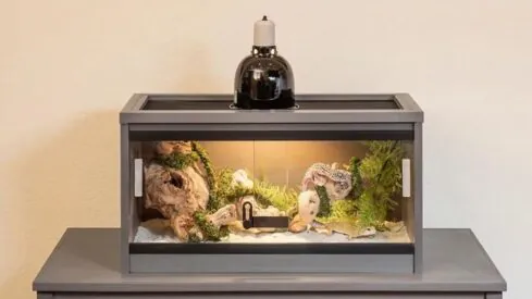 The Mojave Reptile Lounge features front sliding, glass doors for easy access & cleaning, a large, mesh screen top to accommodate most UV & heat lamp set-ups and vented side panels for optimal ventilation.