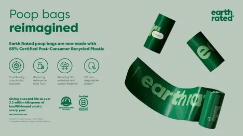 Earth Rated has launched a new generation of poop bags, made from 65% certified post-consumer recycled plastic, giving a second life to over 2.2 million kilograms of landfill-bound plastic a year. This 65% ratio enables us to keep the same high-quality and leak-proof guarantee while making it the Earth Rated bag with the smallest carbon footprint yet!